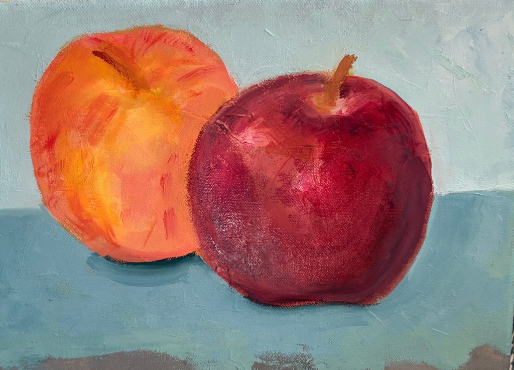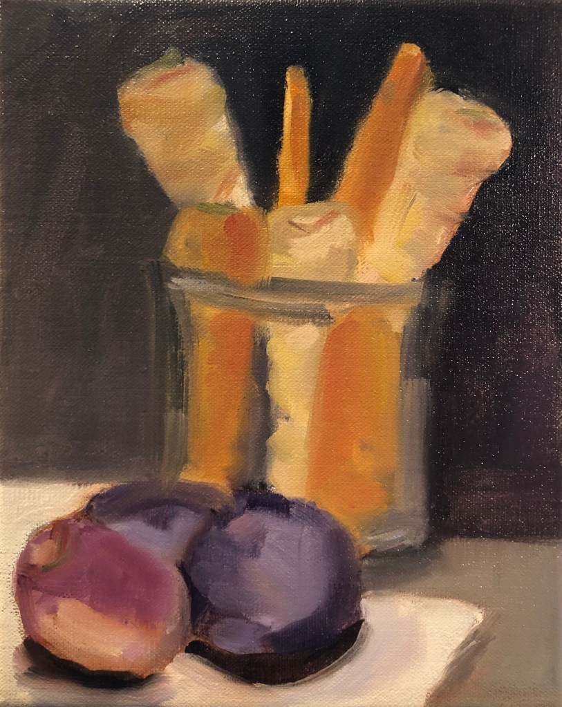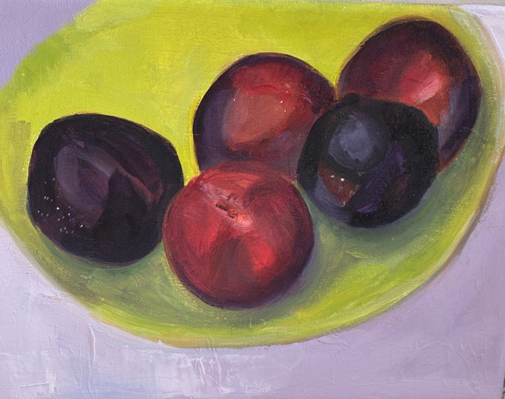 Black Plums, 9×12, 2025, Oil on LinenBeets, Carrots, Parsnips, and Rutabaga, 8×10, 2021, Oil on LinenTwo Apples, 9×12, 2025, Oil on Linen