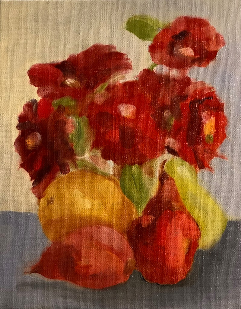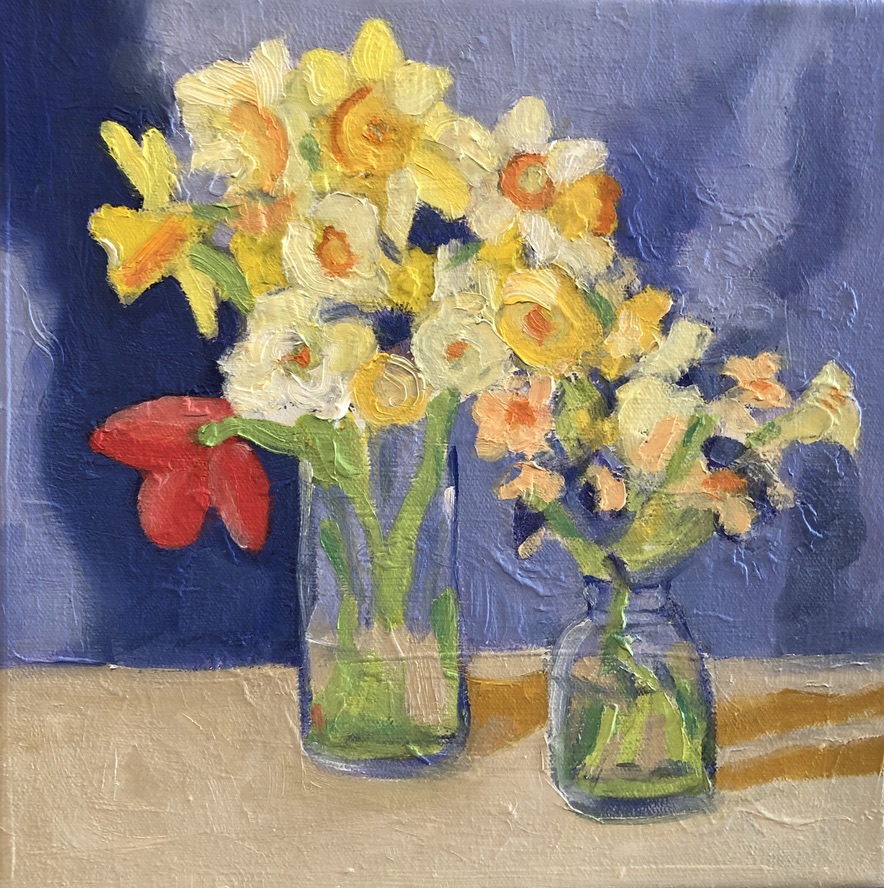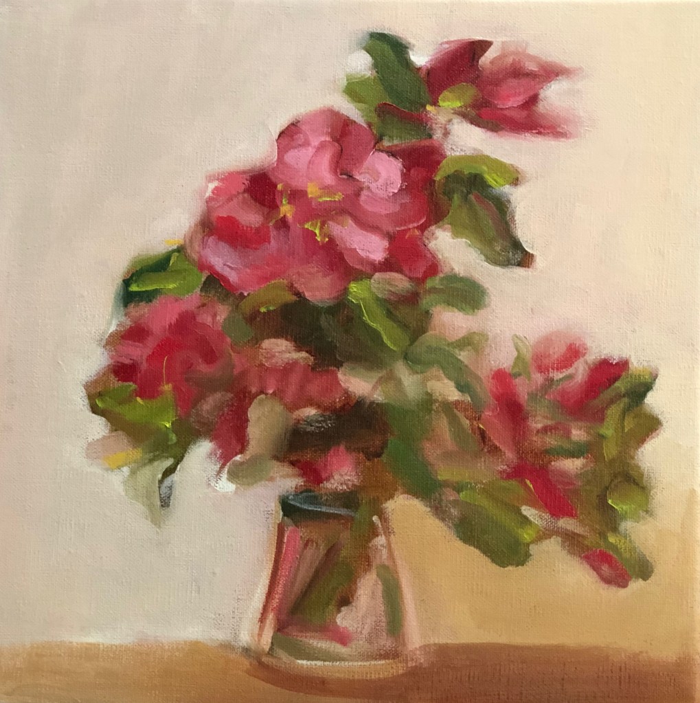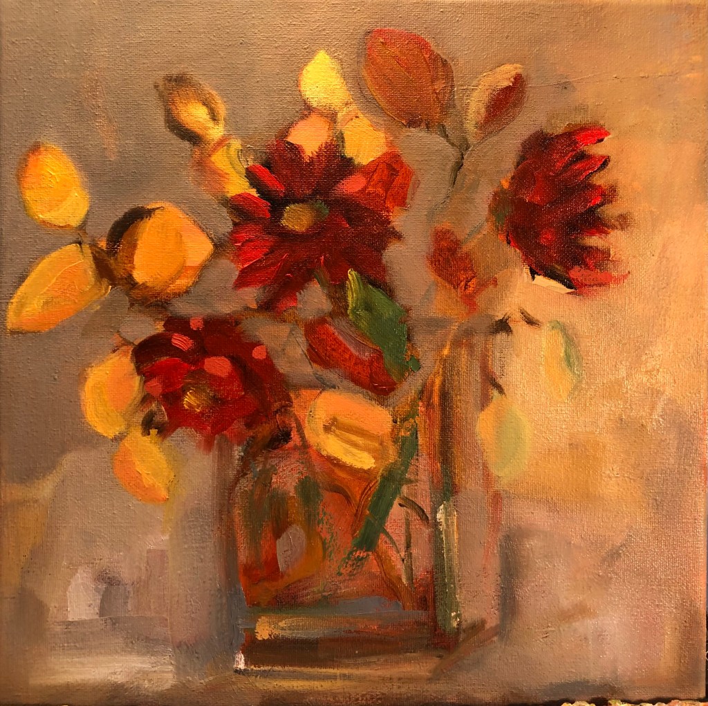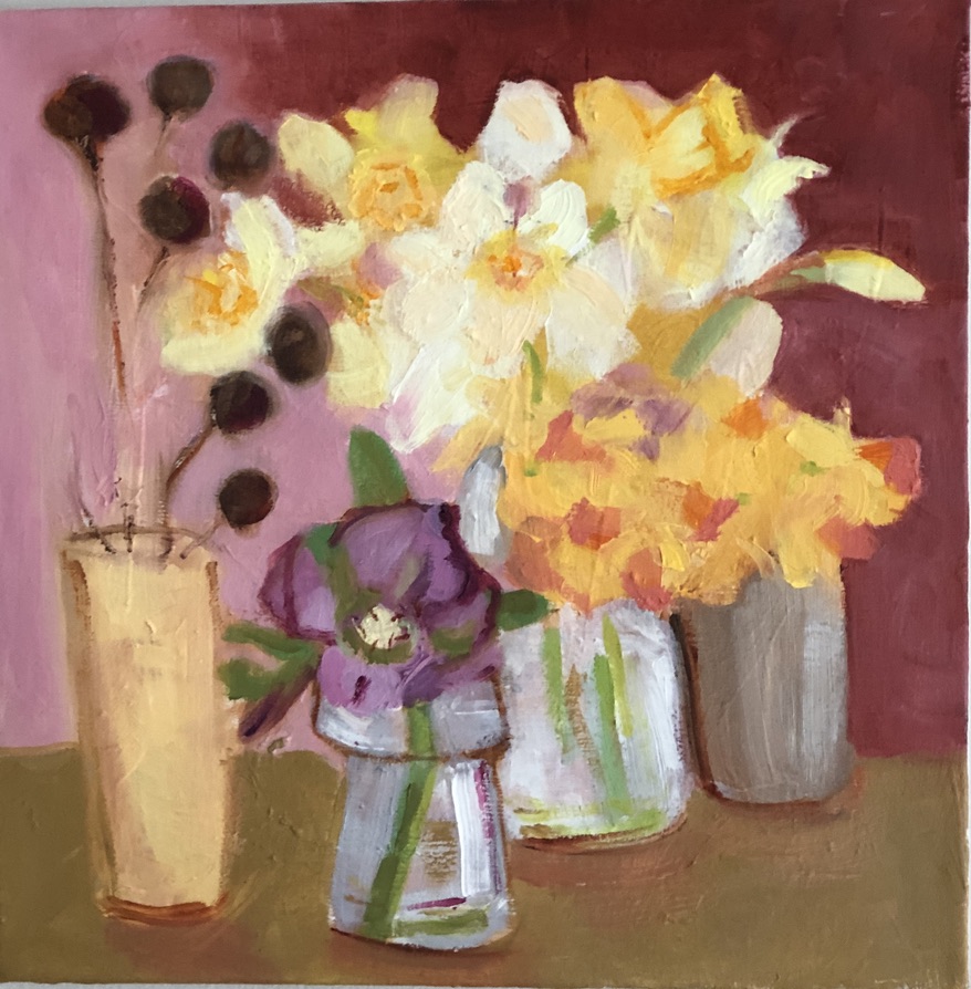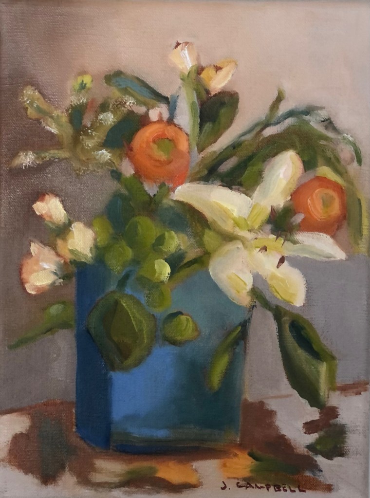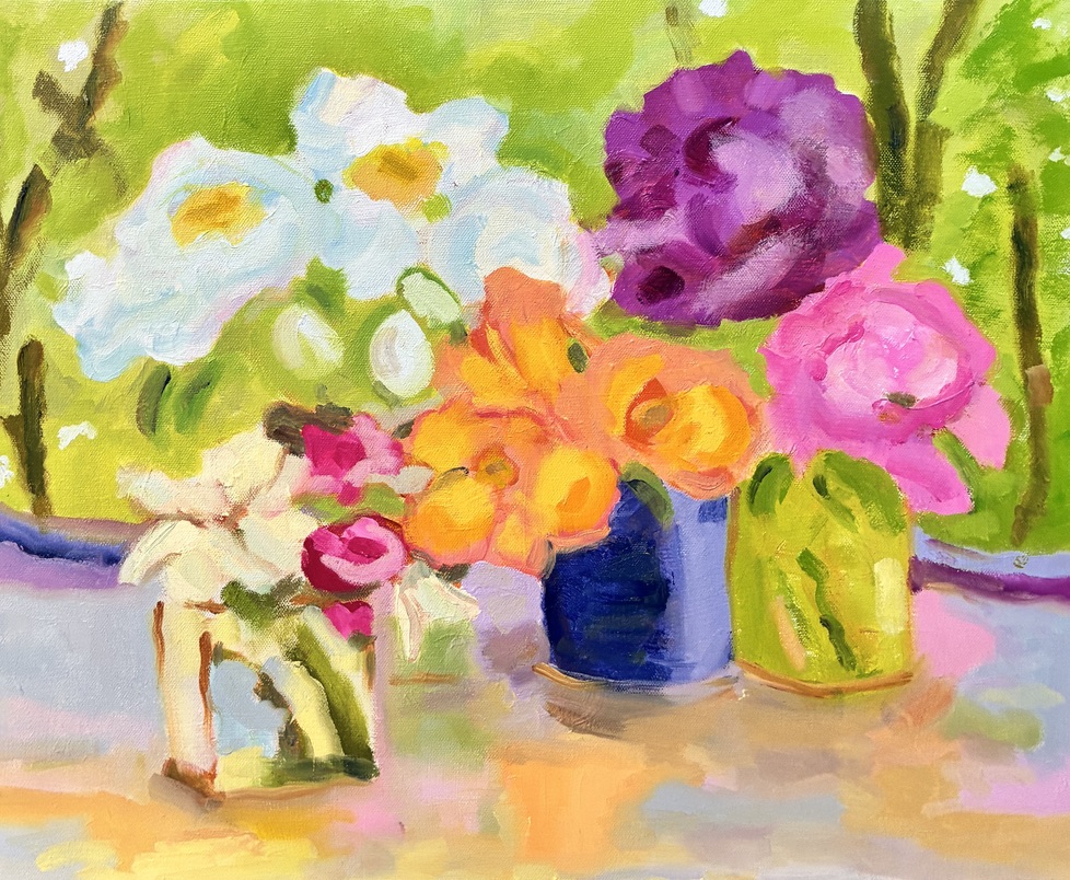 May Garden Party, 20×16, 2025, Oil on CanvasDaffodils and Tulip, 12×12, 2023, Oil on CanvasHellebore & Daffs, 12×12, 2024, Oil on CanvasDahlias and Pears 8×10, 2021, Oil on LinenFire Cracker Azalea, 12×12, 2021, Oil on LinenDahlias on Blue, 14×18, 2024, Oil on CanvasRanunculus with Lily, 9×12, 2021, Oil on LinenSafflowers, 16×20, 2019, Oil on CanvasConeflower, 9×12, 2023, Oil on LinenFlowering Quince, 24×18, 2024, Oil on CanvasGerbera Daisy, 9×12, 2023, Oil on LinenDahlias and Witch Alder, 12×12, 2023, Oil on Canvas