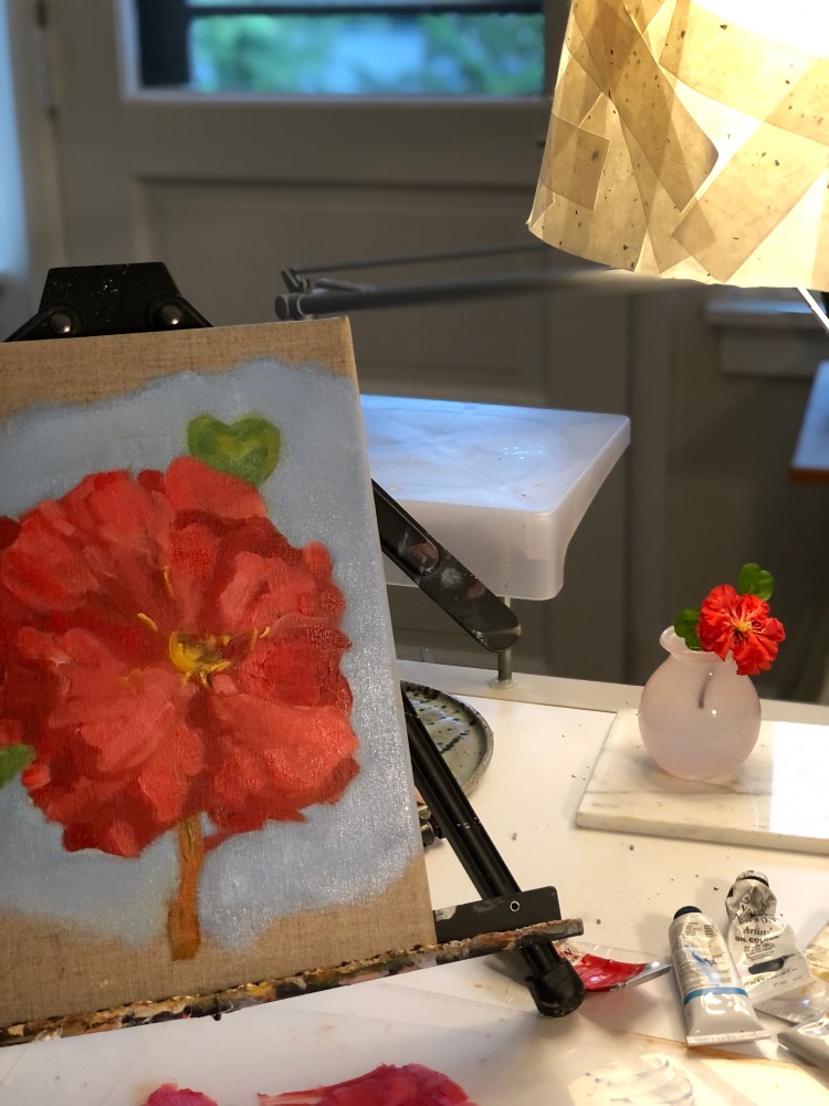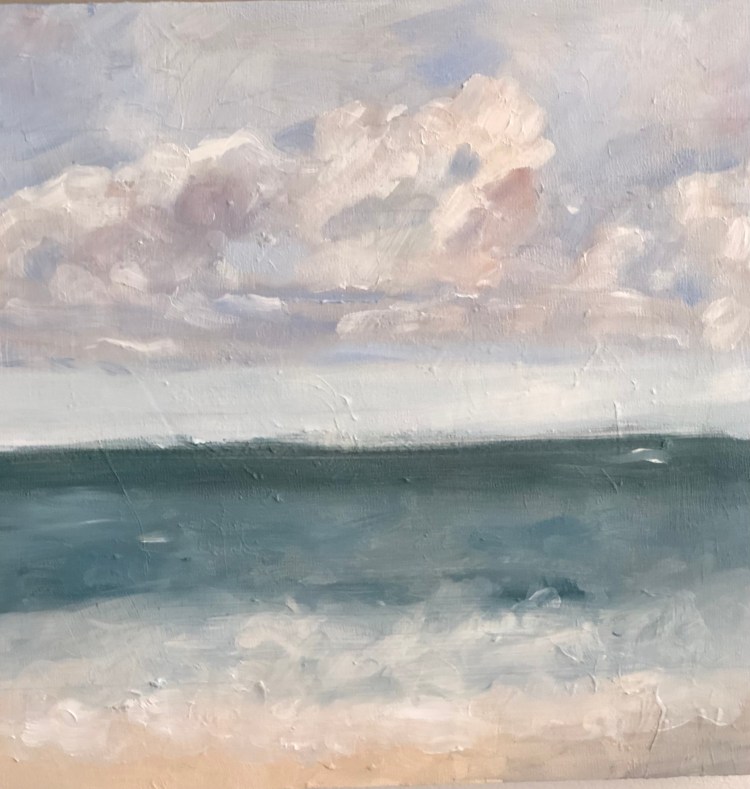 Process Flowering Quince 2023; Oil on Linen 9×12 Palette on Site Emerald Isle (before the storm) 2023 Oil on Panel; 12×12